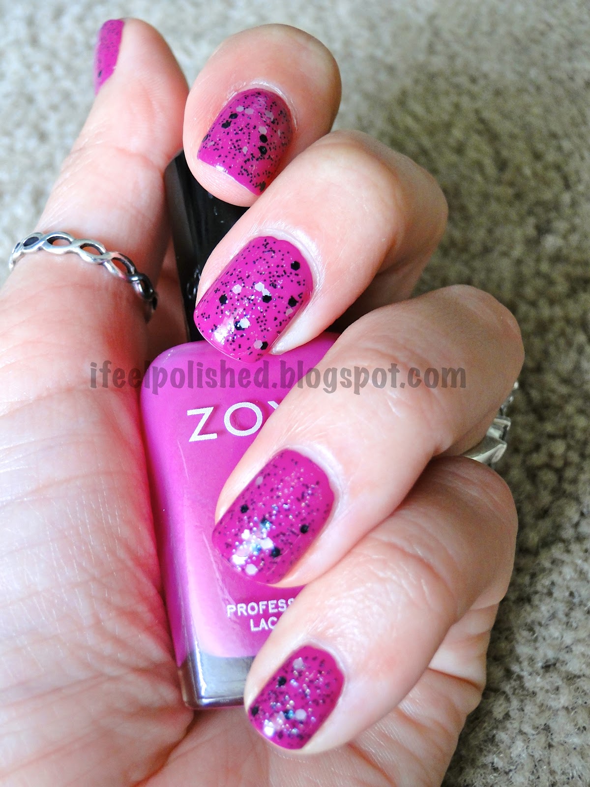 Reagan can be a summer color, but after wearing her for nearly a week now, I think I've decided I'd wear her more in the fall or winter rather than the summer. Not that I really ever subscribe to the notion that polishes can only be worn during a certain time. I rock a neon pedicure nearly all winter! :) She just seems like a fall color to me. However, she turned out a little brighter in the pictures than she is in real life, so bear that in mind. After my two coats of Zoya Reagan, I also did two coats of Nubar Black Polka Dot and Nubar White Polka Dot. These are new additions to my collection and I LOVE THEM. The black consists a larger hexagonal and small circular black glitter. The glitter is not sparkly at all. The white consists of larger hexagonal and smaller circular white glitter that is more iridescent than sparkly. They are both awesome polishes that I would highly recommend. I did, however, have to fish around just a little bit for the larger glitter pieces. These pictures were taken indoors without flash on a sunny day! Enjoy! :)