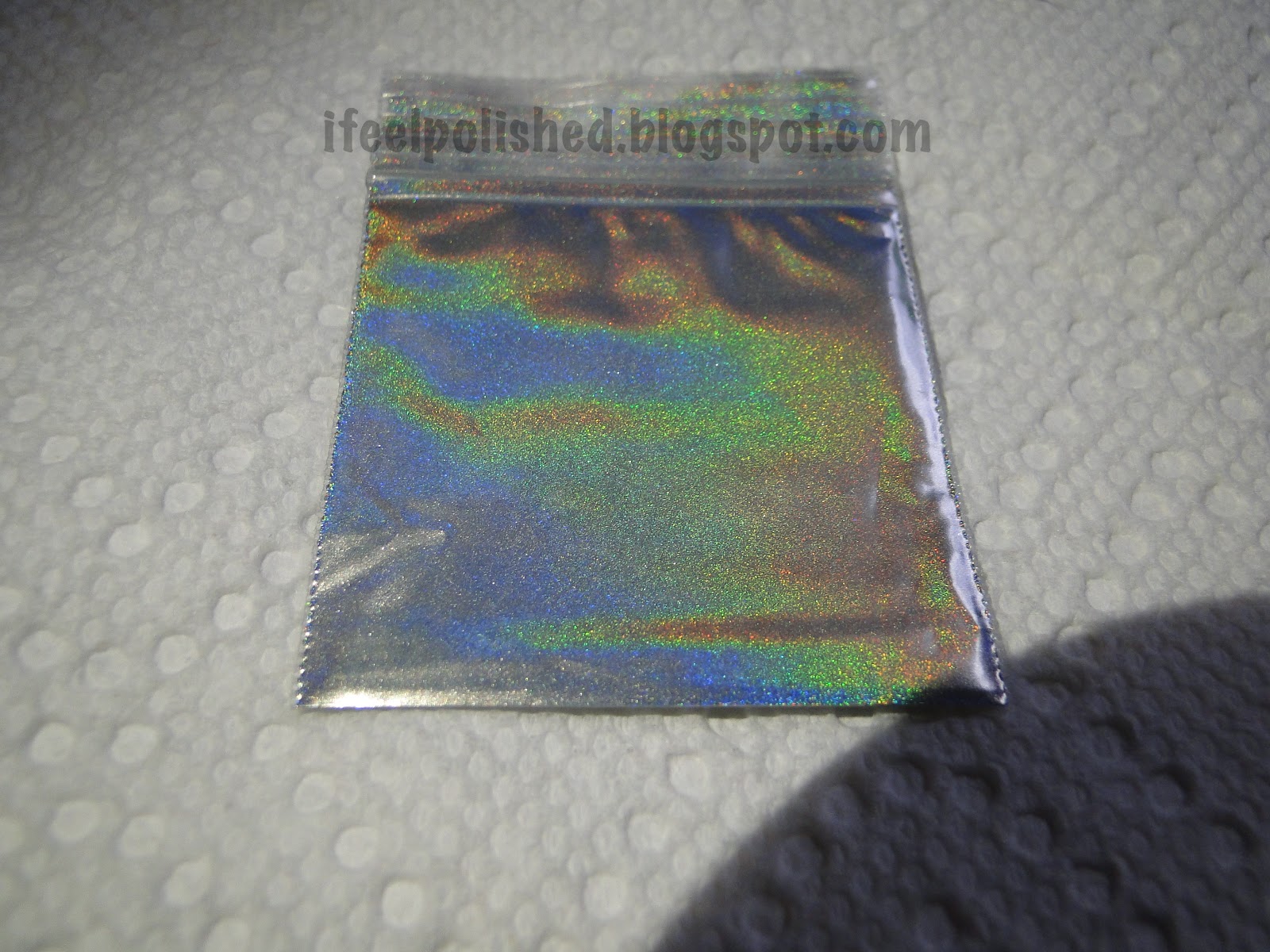 After gleaning information online, I decided to give it a shot! Spectraflair comes in fine, medium, and coarse grade powder. This is definitely a fine powder, not a glitter! Judging from the pictures I found online, the coarse grade seemed to have the strongest linear holo effect. I ordered one gram of coarse grade Spectraflair holographic powder on eBay for $20. That seems a little steep, but the auction stated that it would make 5-6 bottles of holographic polish. Assuming you only got 5 bottles out of it, that's only $4 per bottle! When compared to holographic polish costs, that's an awesome deal! Plus, after having made one polish now, I can confidently say that I will get more than 6 bottles of polish out of my powder. So my powder traveled from CA to FL in record time (3 days!) and I was so excited to get it! It came in a baggie...look at that gorgeous holo effect just in the bag!