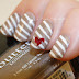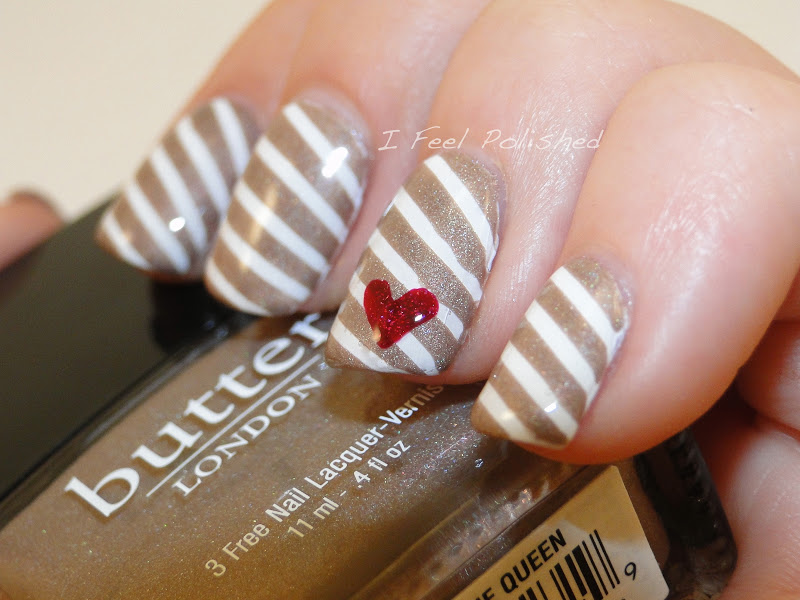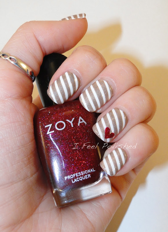 I chose to use butter London All Hail the Queen, which is a gorgeous beige holo, Zoya Purity, and Zoya Blaze. I began by polishing my nails with two coats of Purity. While I allowed that to dry completely, I polished several little Blaze hearts onto a plastic baggie. (If you've never made your own nail decals this way, I highly suggest it! It's so easy and if you make a mistake, it isn't like your nail is ruined! You just polish your design onto the bag, allow it to dry really well, peel it off, and place it on your nail!) After Purity was dry, I placed striping tape on my nails in diagonal lines. I polished All Hail the Queen over the tape and then pulled each piece off immediately. Once I was done with all of my nails, I put one of my baggie heart decals on each of my accent nails. Viola! Beautiful, neutral, sparkly, and it didn't even chip for the whole week! The first and last picture have flash to help show a little of the holo goodness. Enjoy! :)
