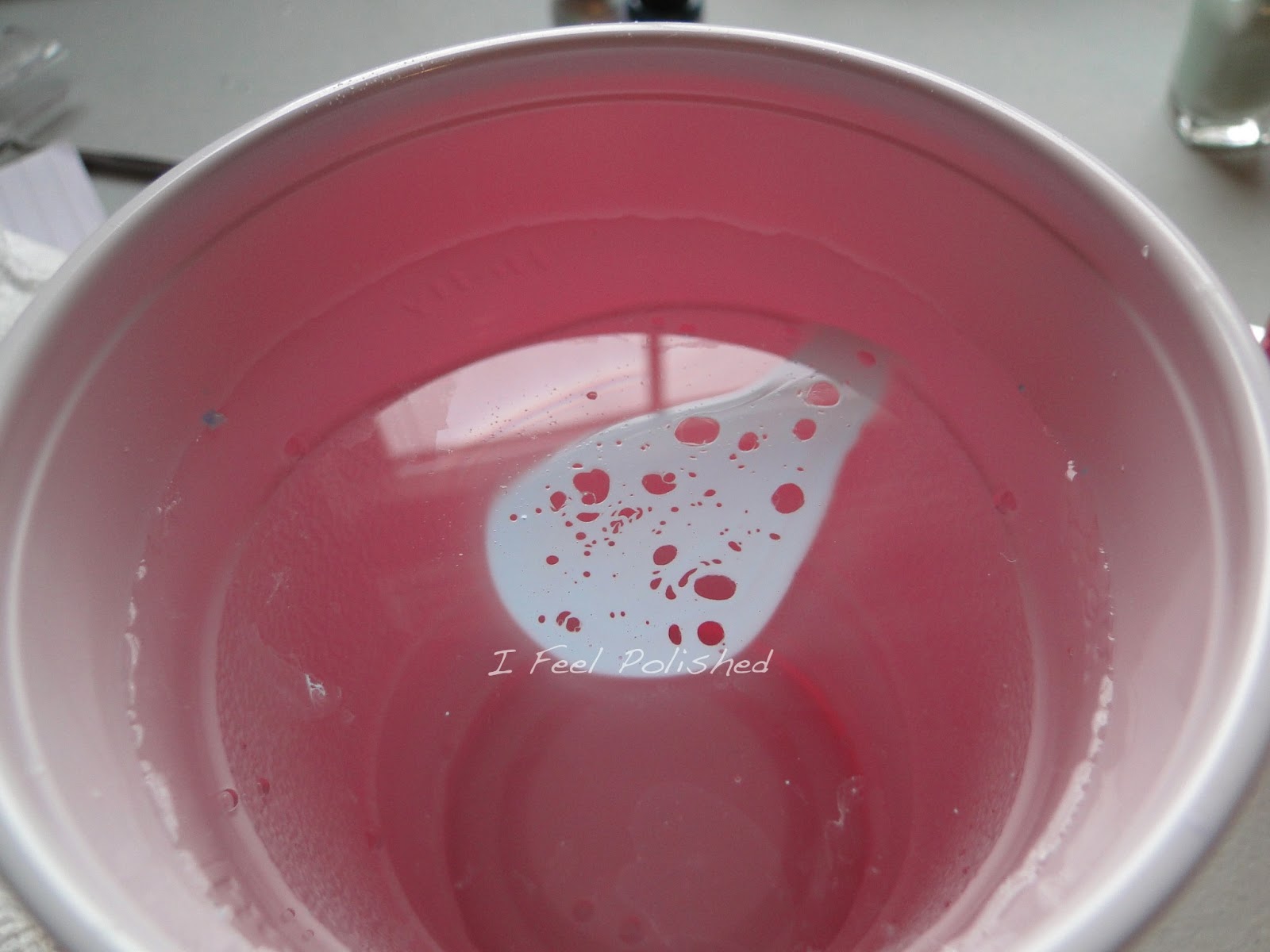 Here's where the trial and error came in. The video says to spray hand sanitizer into the polish blob. However, when I did that, it was too forceful and ended up making the polish separate terribly. It also had a lot of bubbles in it. So, I figured out that spraying the sanitizer on my hand while I held it over the cup worked much better. It should look something like this: