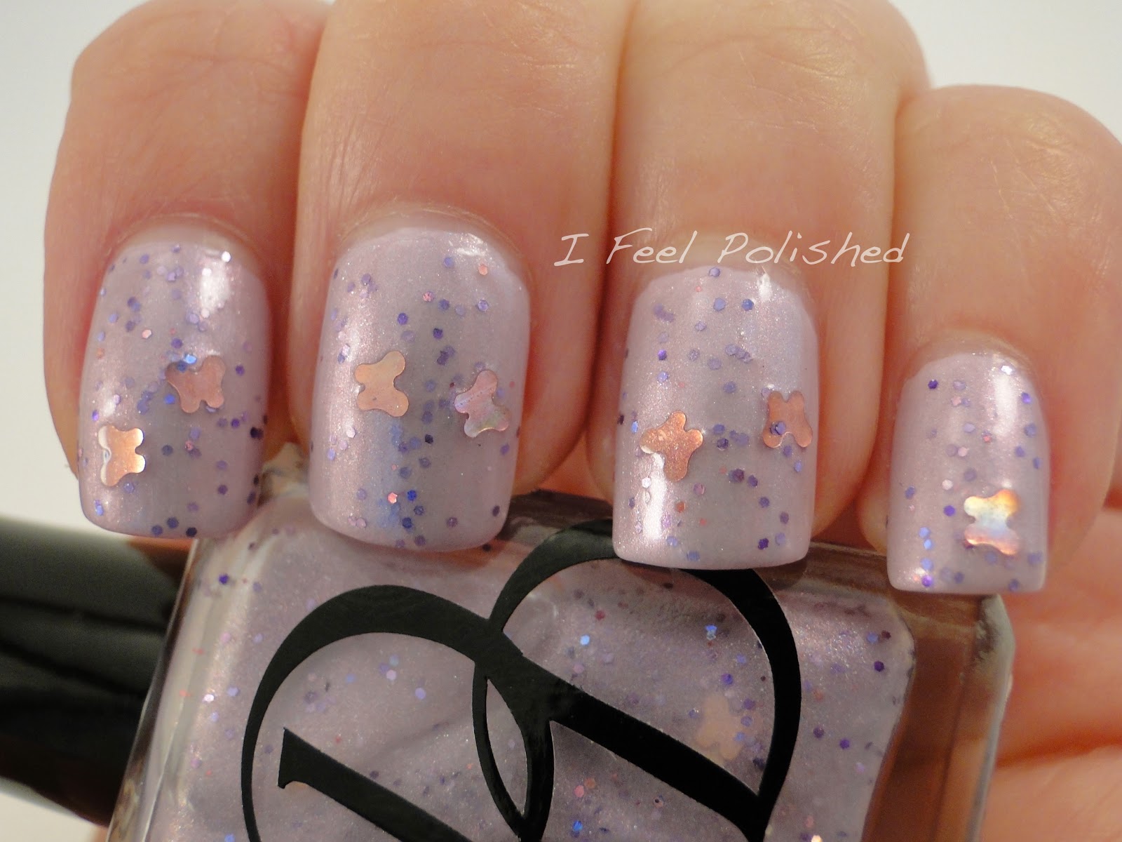 Fly Away from Daring Digits is up for the Indie Spotlight today! Since many people are sick of winter and ready for spring, I thought this polish would be perfect for today! Fly Away is a sheer pinky purplish base with pink and purple glitter and little pink holographic butterflies. I did two coats of Fly Away over two coats of Zoya Heather. This polish is so pretty and delicate. I love it and I adore the cute little butterflies in it even though they do take a minimal amount of fishing to coax them out! Fly Away is 3-free and cruelty free. Enjoy! :)