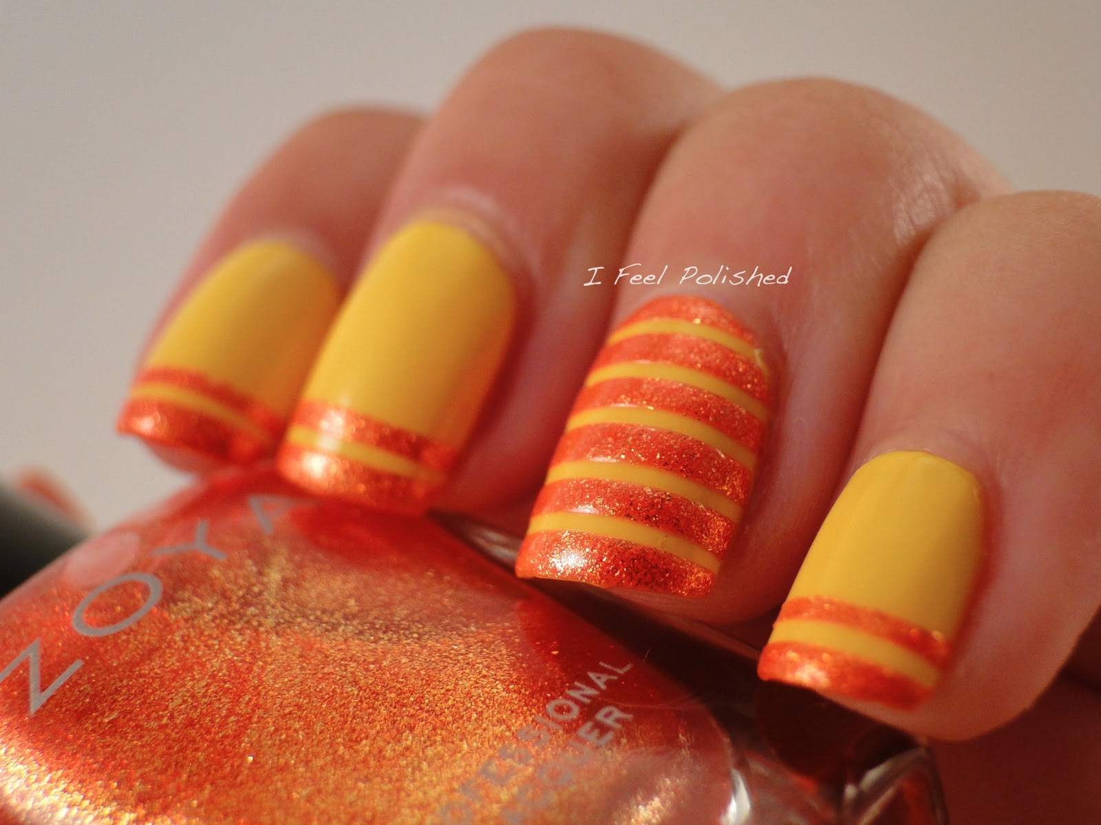 I have some really fun nails to show you today! I got a lot of compliments on these since they are so bright and shimmery! They are really easy, too, as long as you have some striping tape! :) I began with two coats of Zoya Darcy, an awesome, bright yellow!