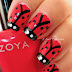 I began with two coats of Zoya Sooki, my favorite red creme polish! Then, I used my thin nail art brush and Zoya Raven to polish a line down the middle of my nail that flares out at the top of the nail, near the cuticle. Then, I made the ladybug head at the bottom of my nail. I added three spots to each side of the bug and used Purity to add two eyes, all with a dotting tool. When that was done, I had adorable little ladybugs on my nails! Enjoy! :)