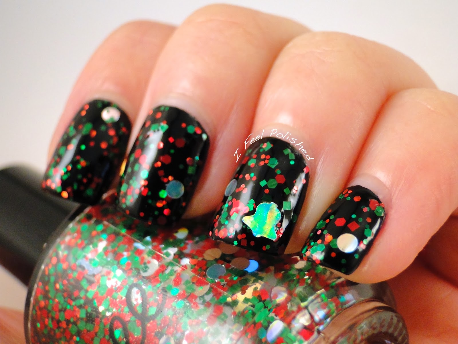 First up, Christmas Time in the City. This glitter topper is LOADED with a variety of red and green glitter, silver holo circles, and silver holo bells (check out that macro below! WHOA.). Yep, bells! SO COOL! And boy are the circles and bells holo-y! I polished one coat of this baby over black to show all of the glittery awesomeness. Such a cool take on a Christmas polish! Enjoy! :)