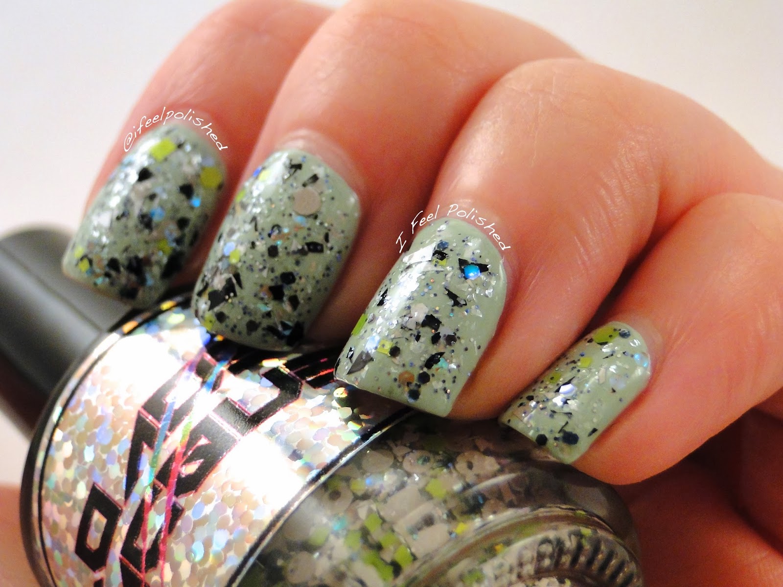 Finally, my other favorite of the group: The Dog Ate My Homework! This baby is loaded with shredded black, white, and grey matte glitter, neon green hexes and squares, holographic and iridescent glitter, and white flakies! WOW! This polish is so unique! I just love it! I did one thicker coat over a light mint green. Be sure to check out! You can't go wrong with her awesome creations! Enjoy! :)