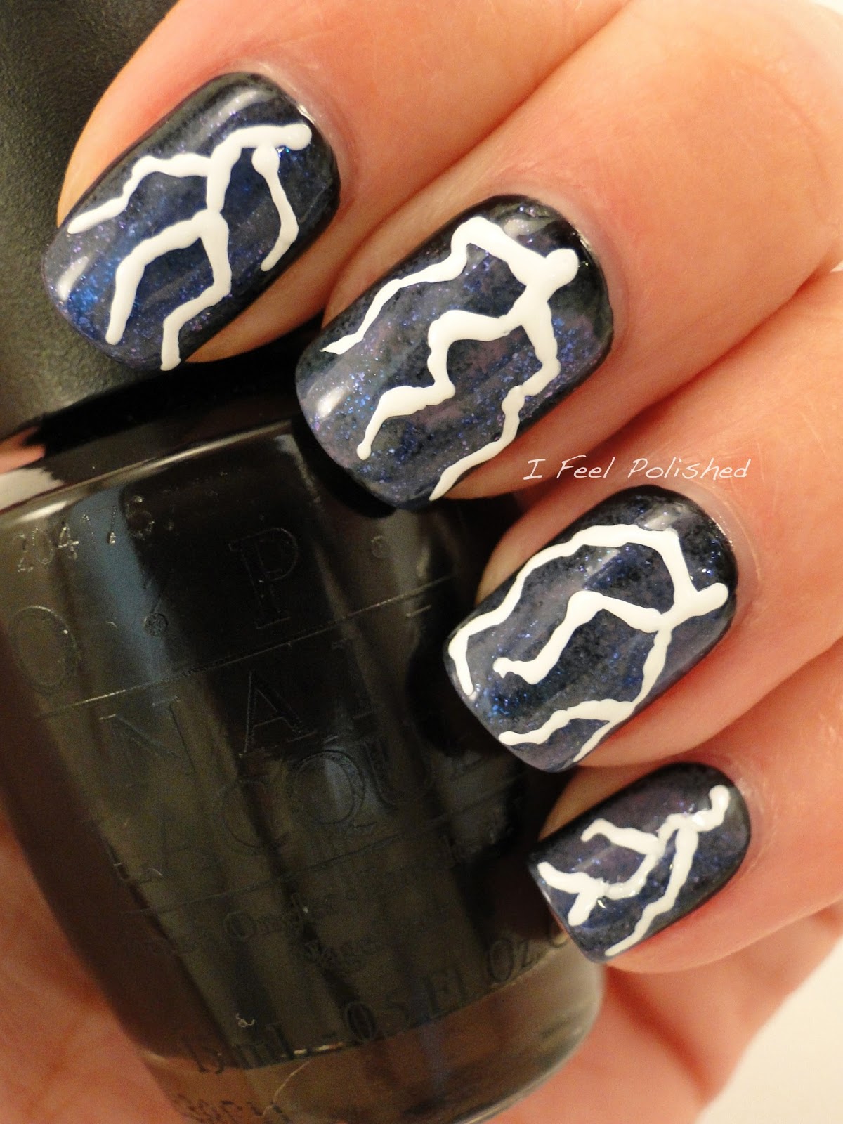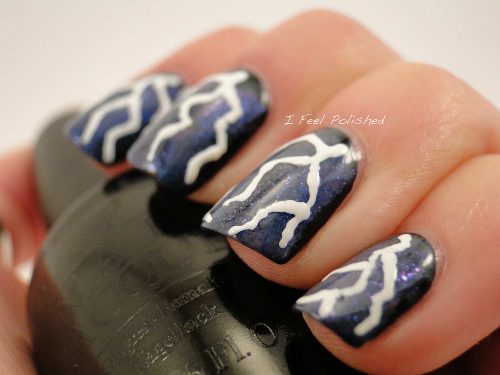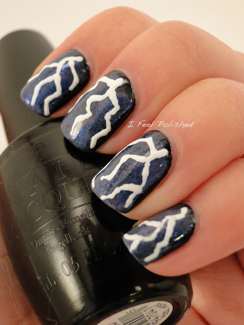 Lightning to me usually means hockey, :) but I did the literal translation of lightning nails today! I began with two coats of OPI Black Onyx. I then used the same sponging method that I used for my galaxy nails. I used China Glaze Recycle, OPI A Grape Fit, and OPI DS Magic to create the base. I then used an orange stick and OPI Alpine Snow to draw on random lightning strikes. Enjoy! :)