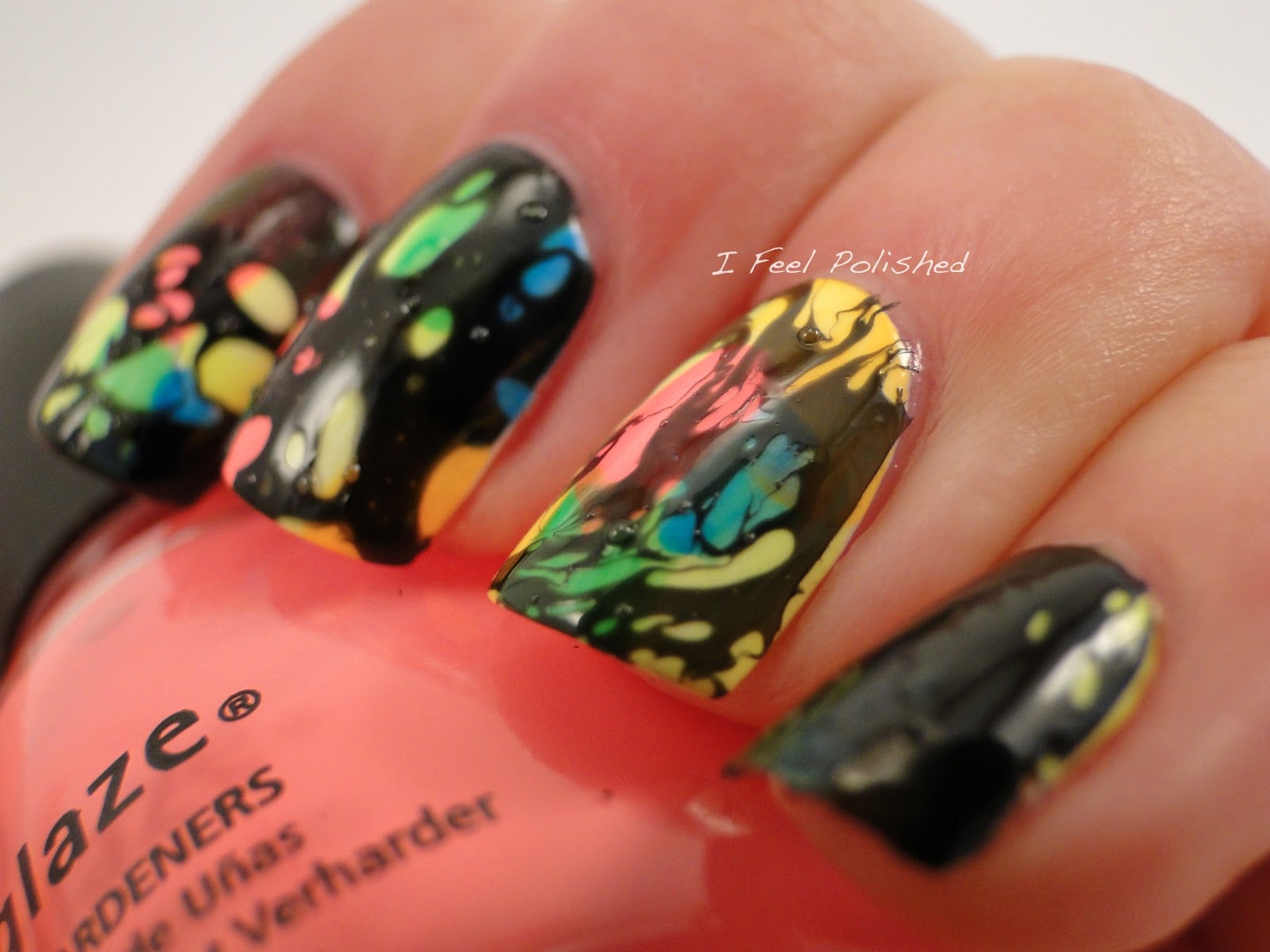I recreated the water spotted nails I did a few weeks ago using the ! These gave me a little trouble at first, but as you'll be able to see, they got better as I went! I began with a randomly striped mani using China Glaze Towel Boy Toy, Kiwi Cool-ada, Flip Flop Fantasy, Yellow Polka Dot Bikini, and Sun Worshipper.