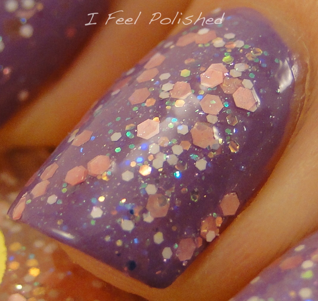 Sonnetarium! I just love Michelle and her polishes! She is a really great indie makers! I won a giveaway hosted by Sonnetarium in November and Lenten Rose was one of my prizes! Lenten Rose has light pink, white, and iridescent glitters in a clear base. I especially love the iridescent glitter! <3 I decided to use it over OPI A Grape Fit and I think these two go together perfectly! I used two coats of Lenten Rose, which went on really smoothly for being so chock full of glitter, over two coats over A Grape Fit. I love to combination! Enjoy :)