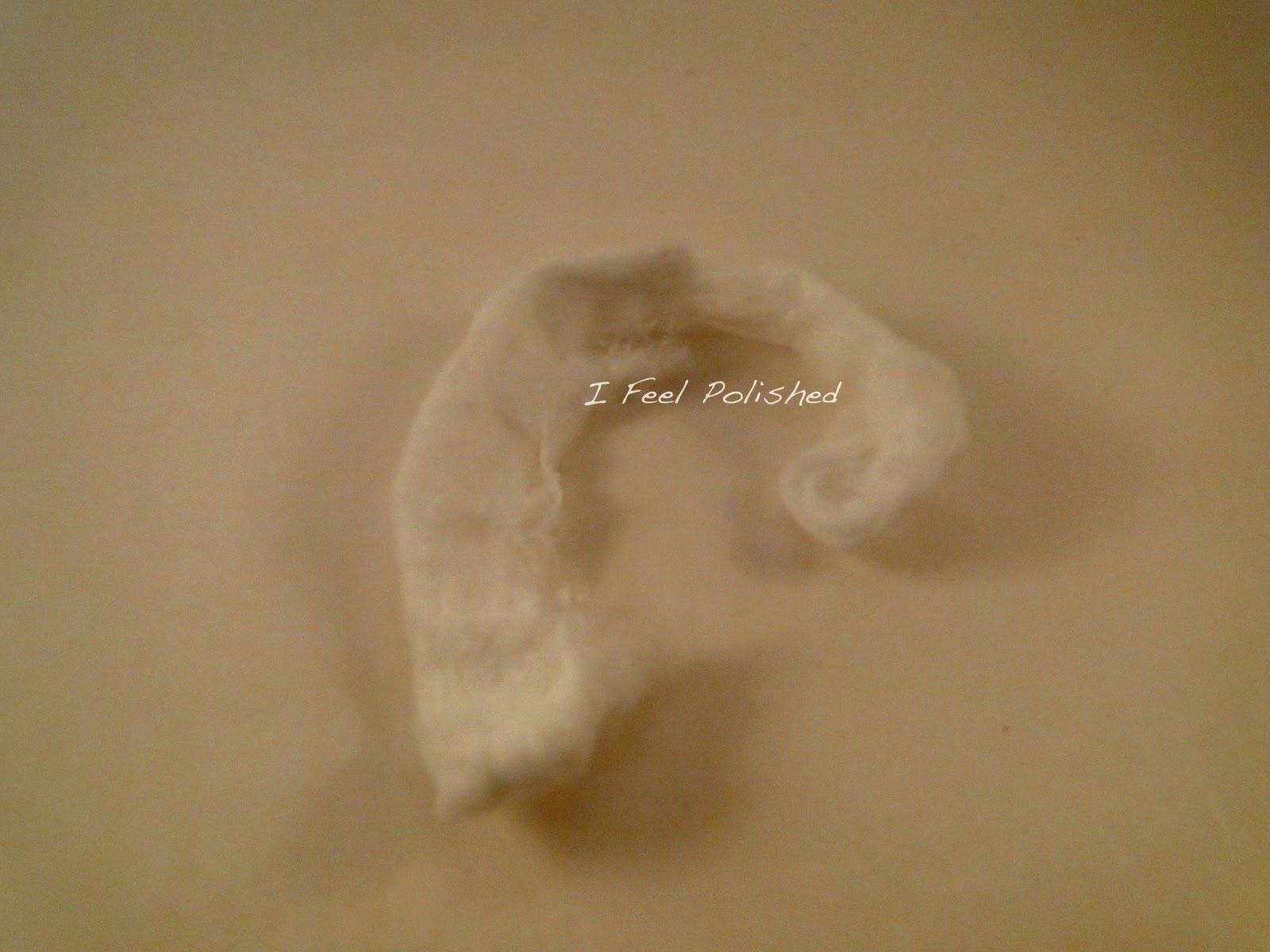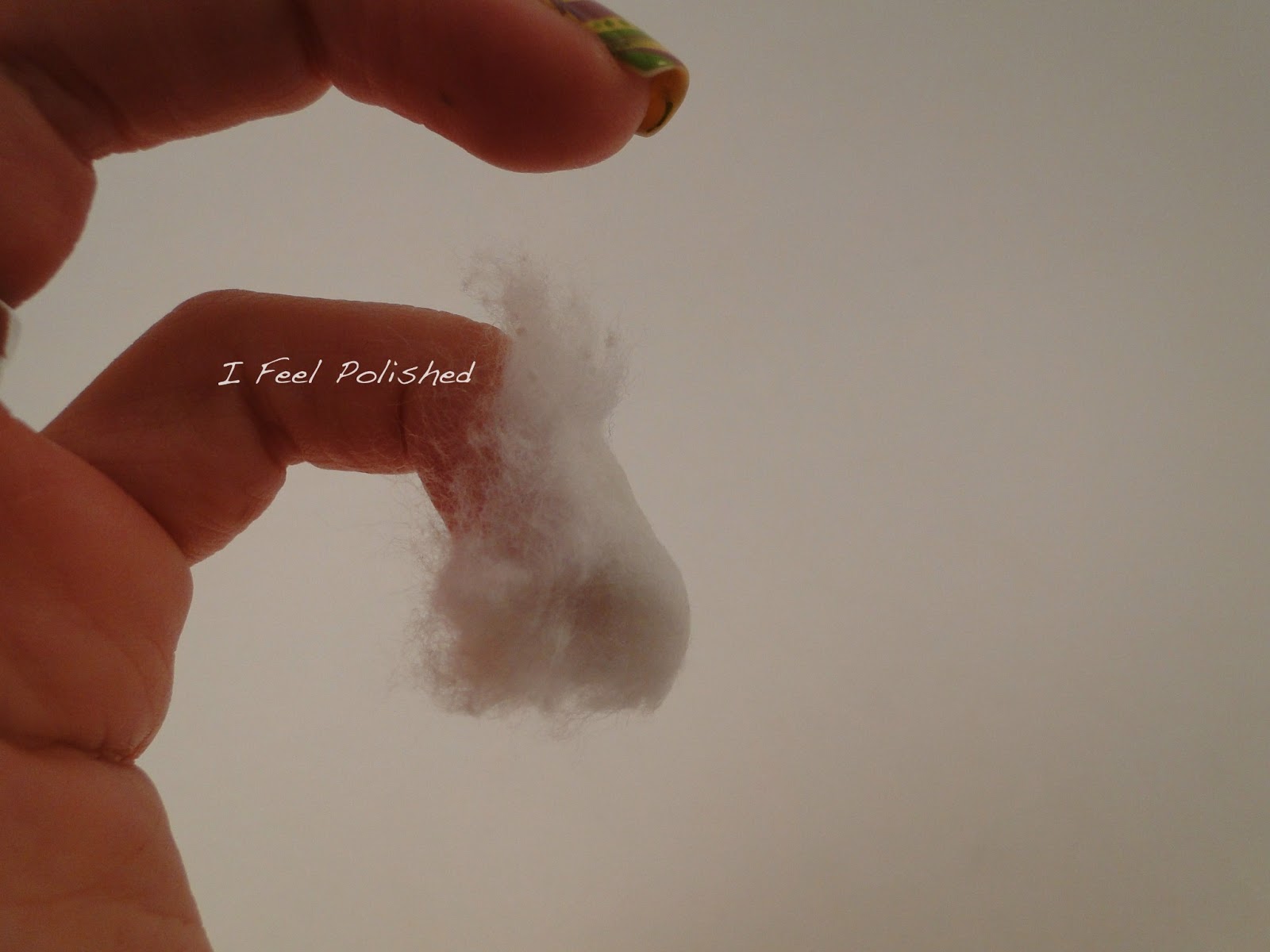Soak the piece of cotton ball with remover and then place in on your nail. I like to hang it over the edge a little and then press it down to seal it around my nail: