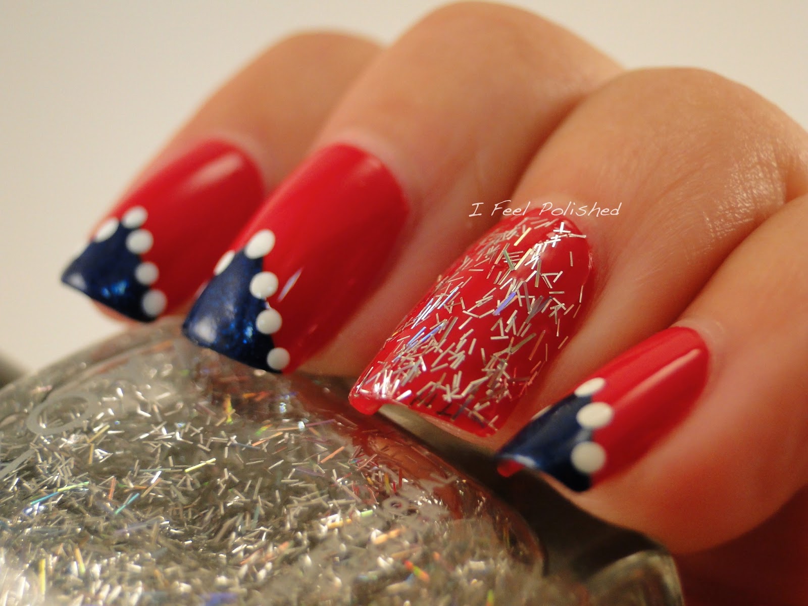 Shall we begin the 4th of July nail art? :) 4th of July is my favorite holiday! I just love fireworks and spending time with my family! The small town where I grew up always has a fireworks show on the lake and I rarely miss it! So, I've been conjuring up ideas for some time now so hopefully you'll like them! This first set of nails is pretty easy!