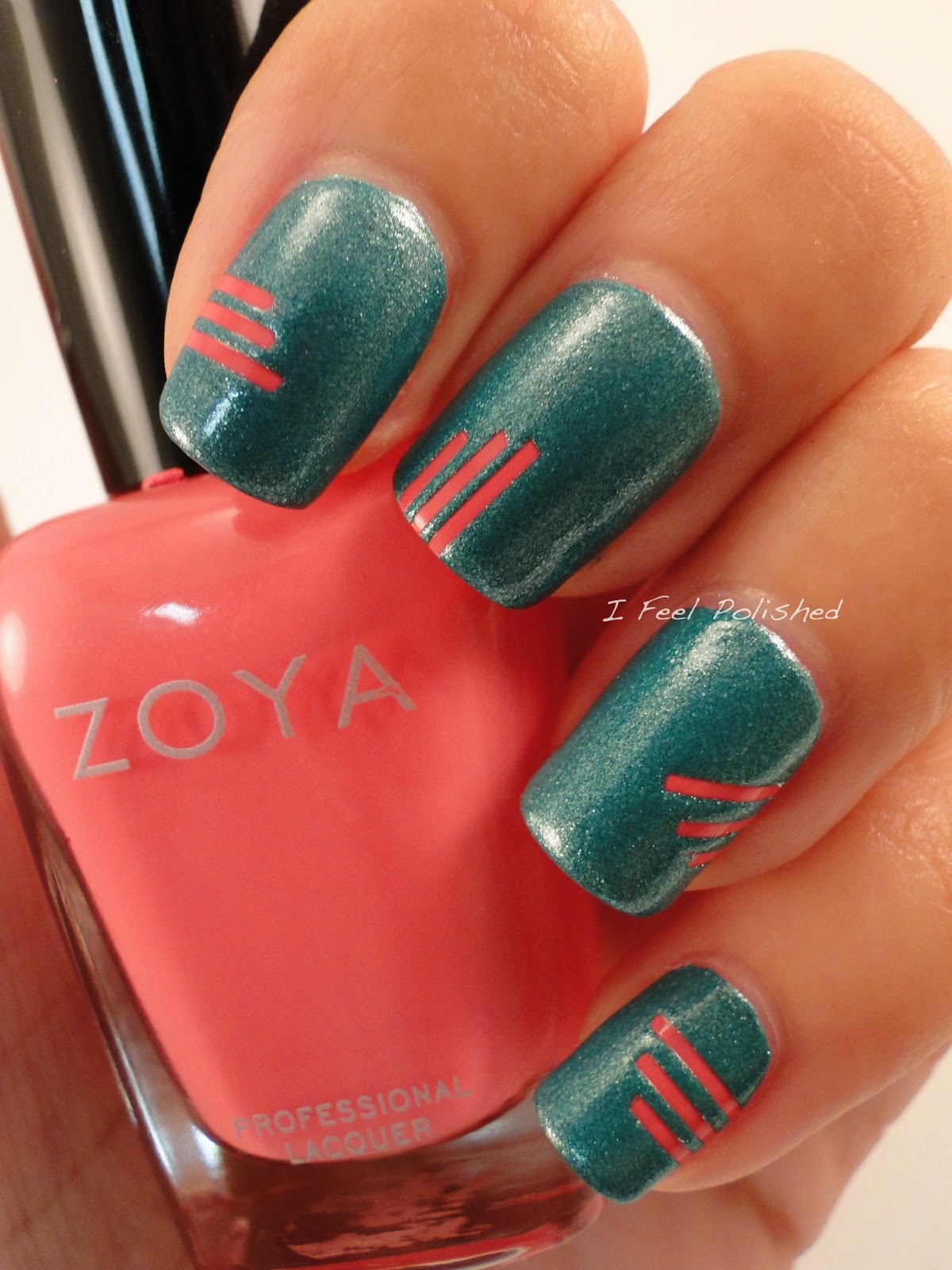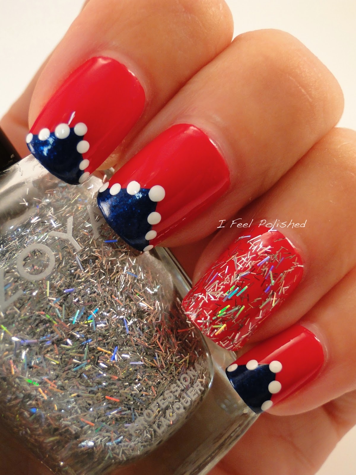 I began with two coats of Zoya America, which is aptly named! :) I added one coat of Zoya Electra to my accent nail, which is a clear base with tons of holographic bar glitter. I love how the colors flash and remind me of fireworks! Unfortunately, this polish hasn't been available in months on Zoya's website, but it should be easier to find on Amazon, eBay, or swap sites. I then used a thin nail art brush to polish on Zoya Song is a triangular fashion at the bottom of each nail. I finished these nails off with some Zoya Purity dots on the edges of the triangle! Enjoy! :)