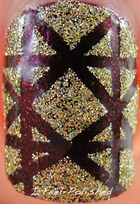Once Jem was dry, I placed my striping tape over her. For some reason, I forgot to take the final picture! I did one more criss-cross section in the bottom half of my nail, like the top criss-cross you see below in the third picture: