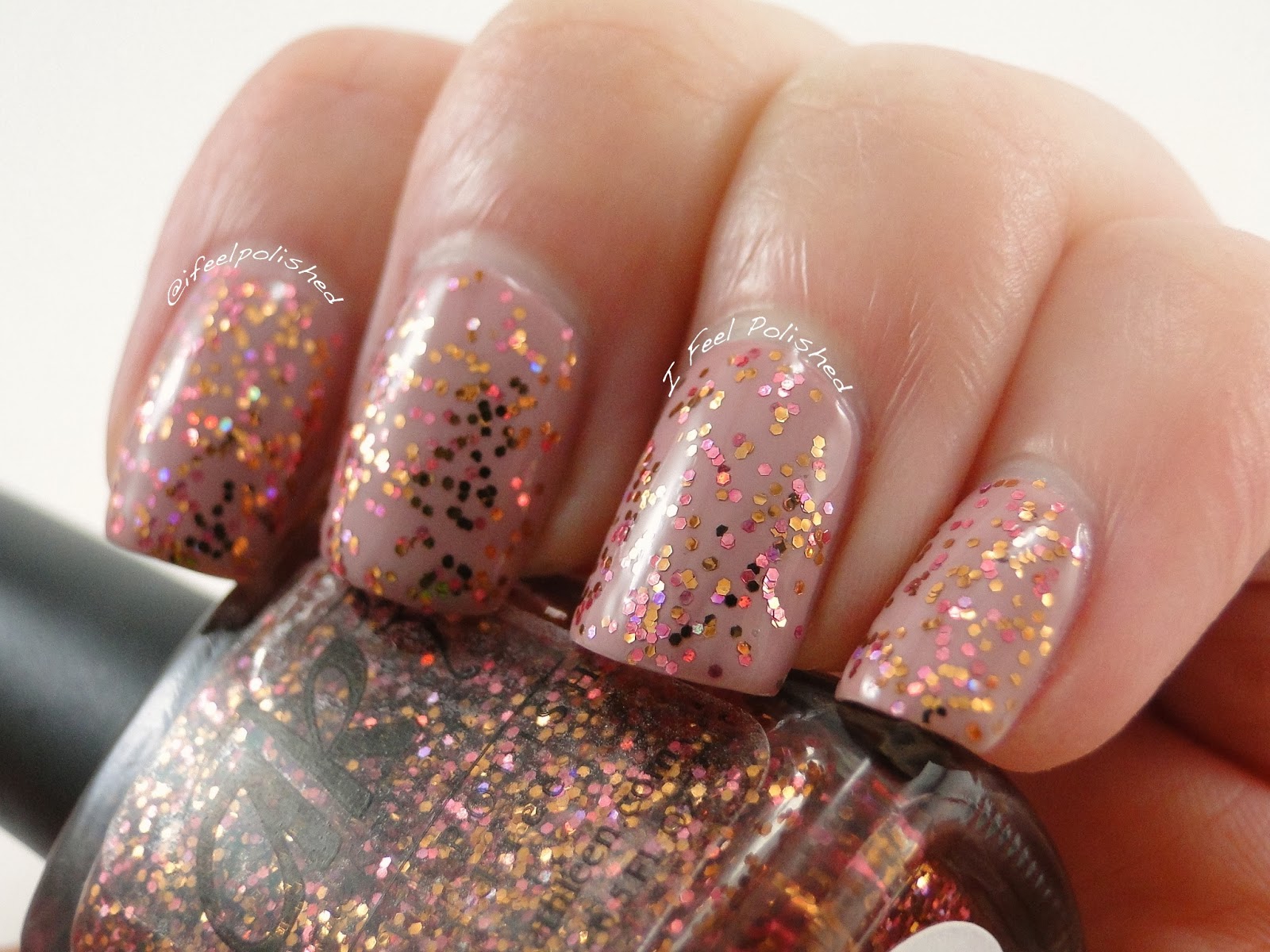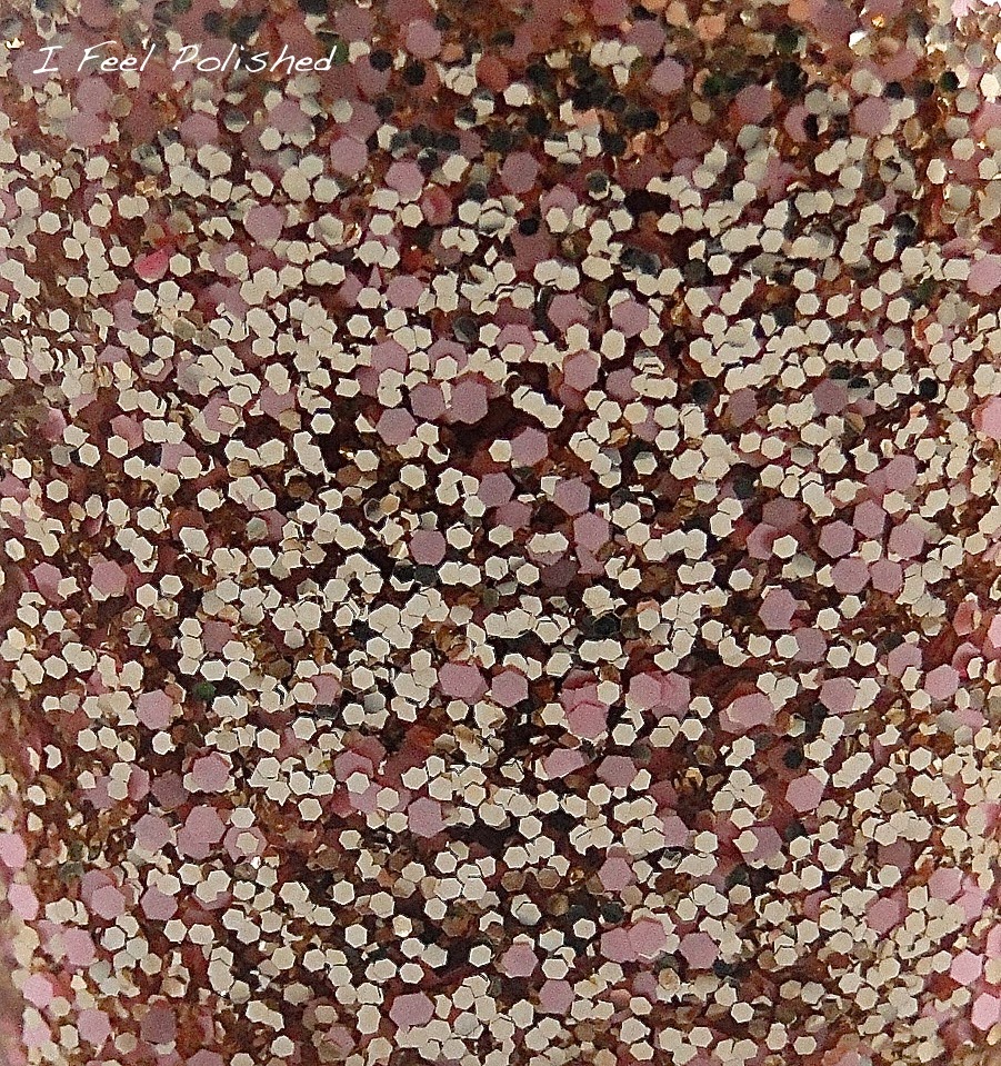 Gayle is caramel and rose colored fine glitter in a clear base. I did one coat over Zoya Rue and it was the perfect amount for a glittery top coat. If I had done a second coat, it would have looked fantasic, too! I love the color combination in Gayle and was so happy with how these turned out!