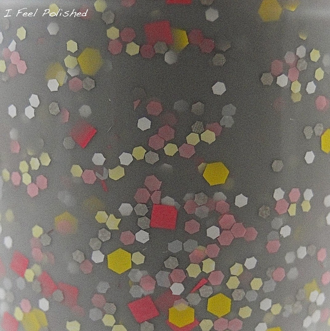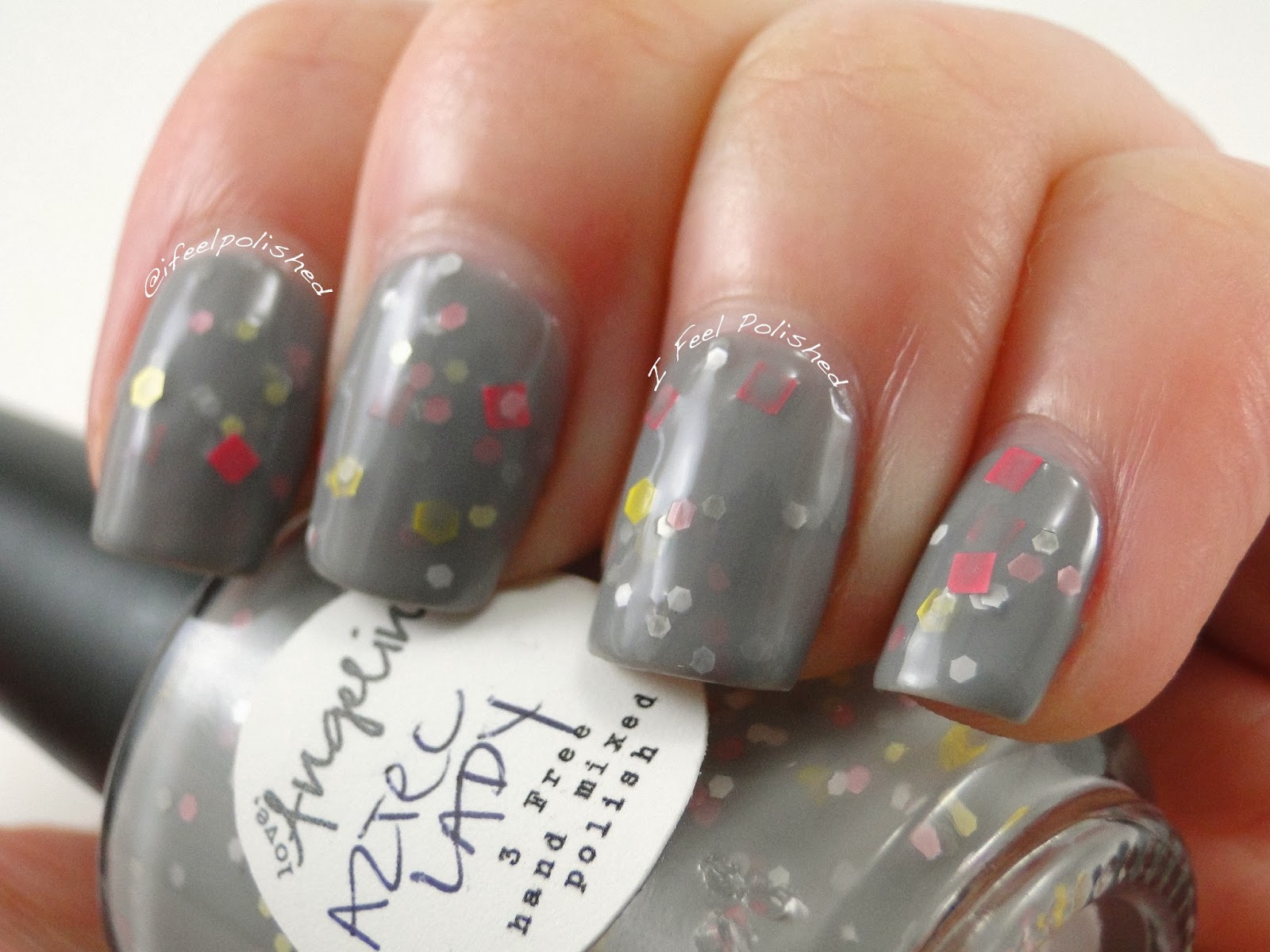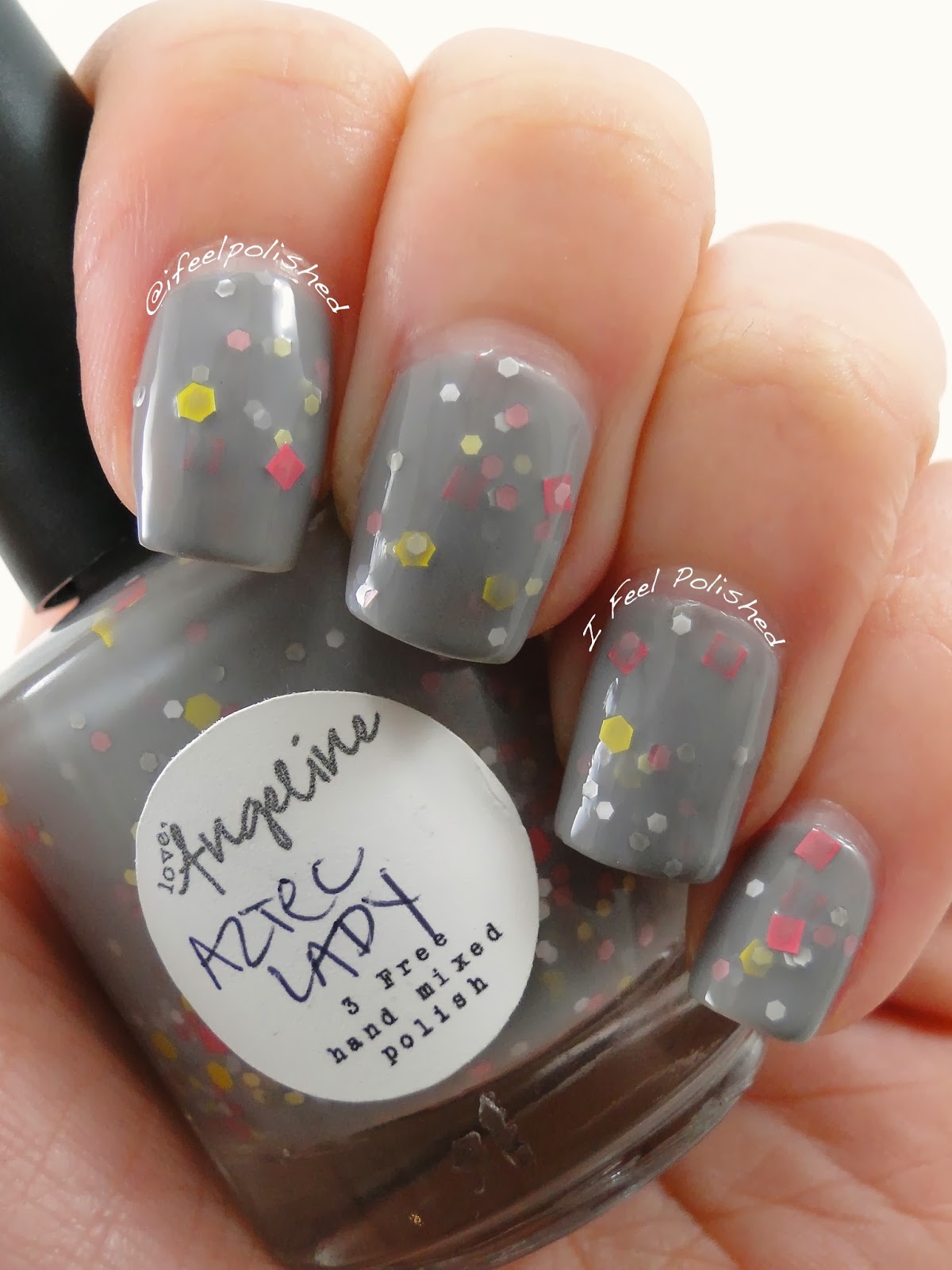 First up is Aztec Lady, a grey crelly with pink, yellow, grey, and white hex glitters! I did three coats for opacity and maximum jelly sandwiched awesomeness! Aztec Lady was smooth and easy to work with! Isn't she pretty?