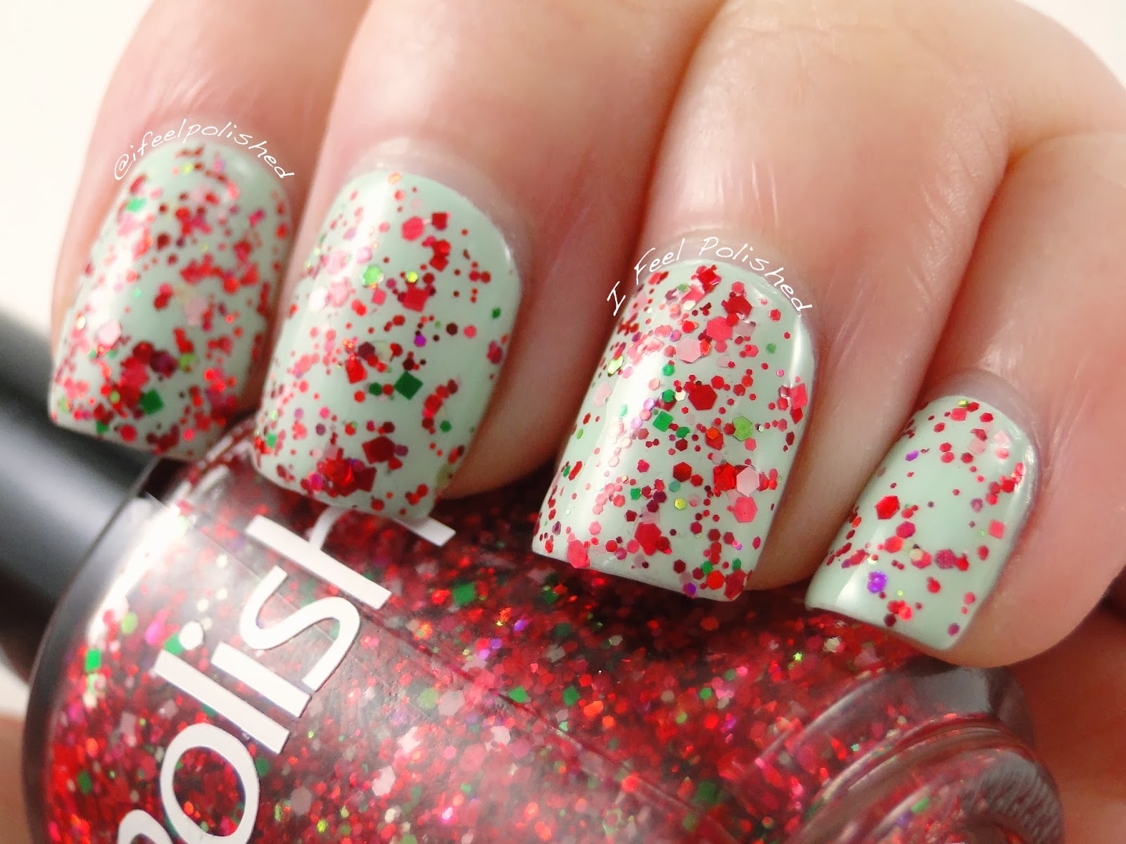 Rose Garden is a clear topper with red glitter is a variety of shapes, sizes, and finishes. The red glitter is accented with pink and green glitter! I did two coats over a mint green polish!