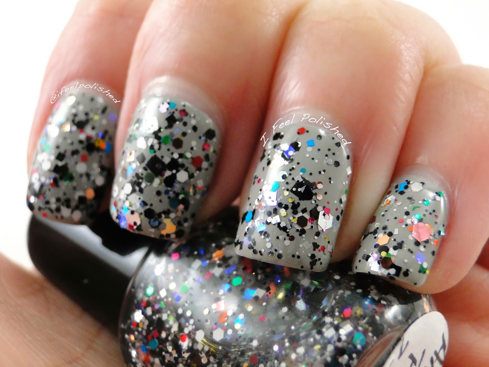 First up is Anti V-Day Party! This clear topper is packed with different types of glitter. There's a lot of black and white glitter and they mix so well with the iridescent and rainbow of other colors of glitter! I did two coats over grey!